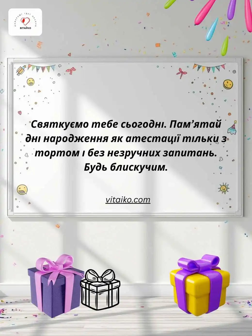 Святкуємо тебе сьогодні. Пам’ятай дні народження як атестації тільки з тортом і без незручних запитань. Будь блискучим.