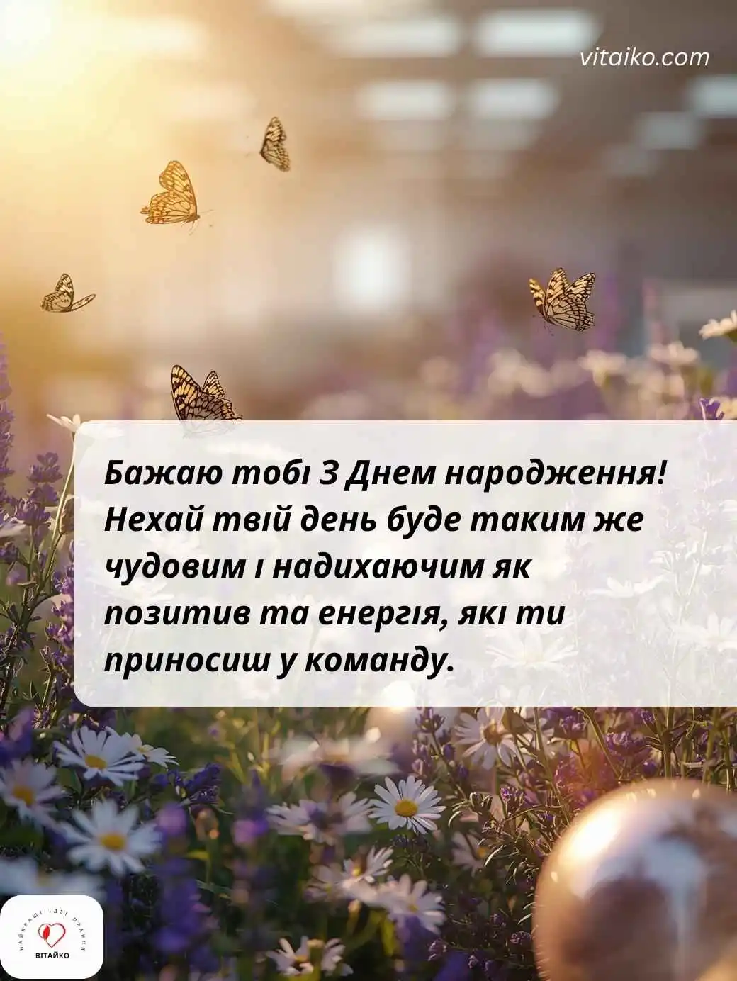 Бажаю тобі фантастичного дня народження, сповненого успіху, сміху та позитивної енергії на роботі. Твоя позитивність та ентузіазм роблять команду сильнішою кожного дня.